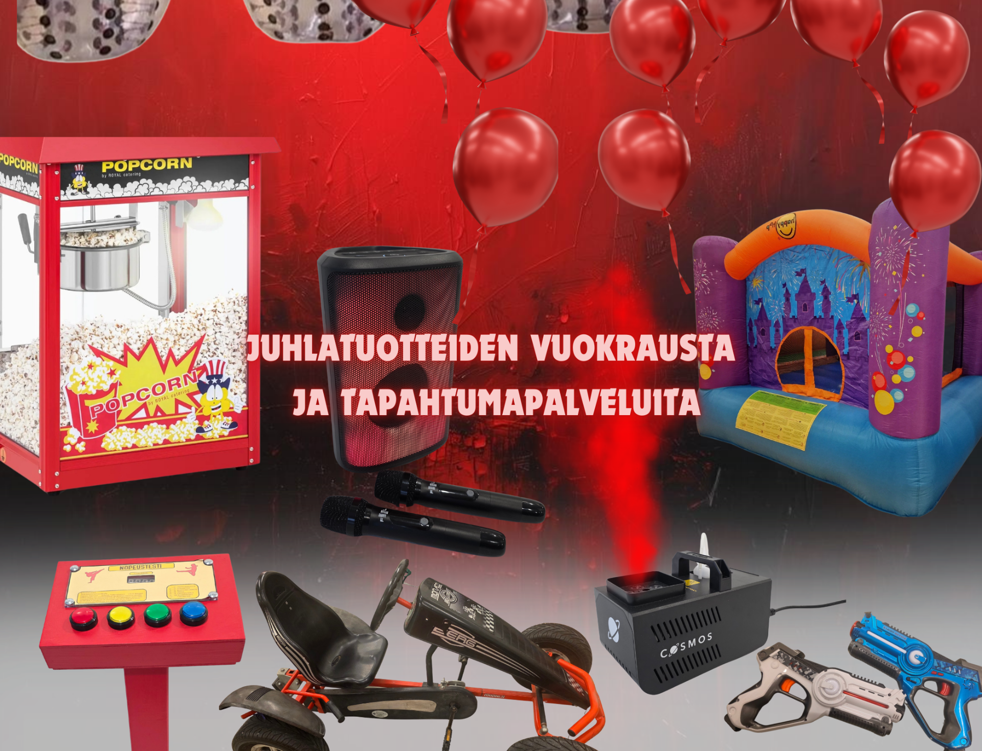 Olipa kyse syntymäpäivistä, kotibileistä, perhejuhlista yritystapahtumasta tai oikeastaan mistä tahansa tapahtumasta, meiltä löytyy tuotteita kaikkiin tarkoituksiin. Jos et halua, että juhlasi muistetaan tiukkapipoisesta emännästä tai hikoilevasta isännästä vaan mahtavasta tekemisestä ja mieleenpainuvista hetkistä niin vuokraa meiltä laadukkaat ja näyttävät välineet, jotka tekevät juhlista ikimuistoiset.