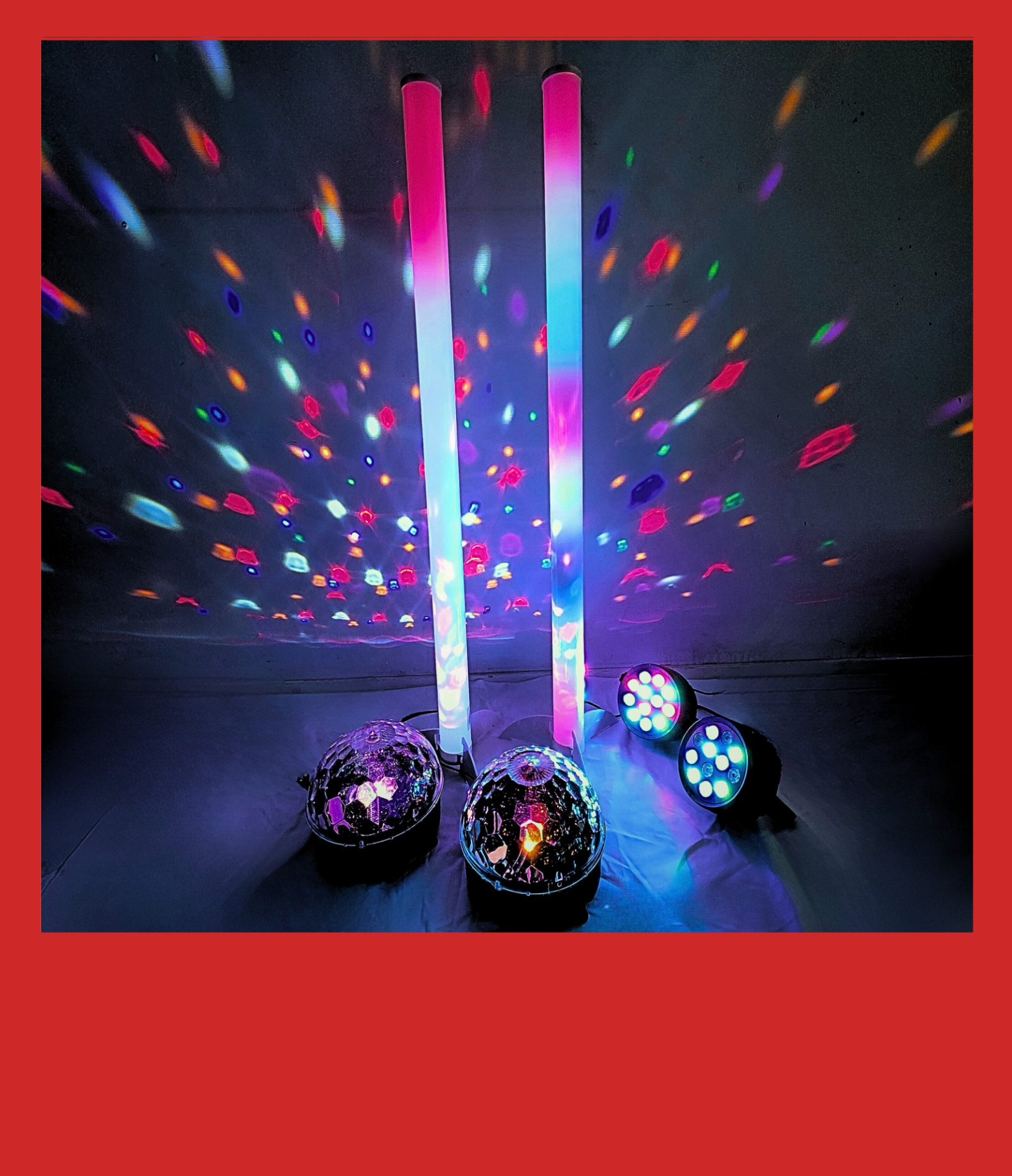 - Sisältää: 2 kpl pyörivät kristallivalot, 2 kpl pystysuorat valoputket (1m) sateenkaaren väreissä, 2 kpl tehokkaat LED-spottivalot.